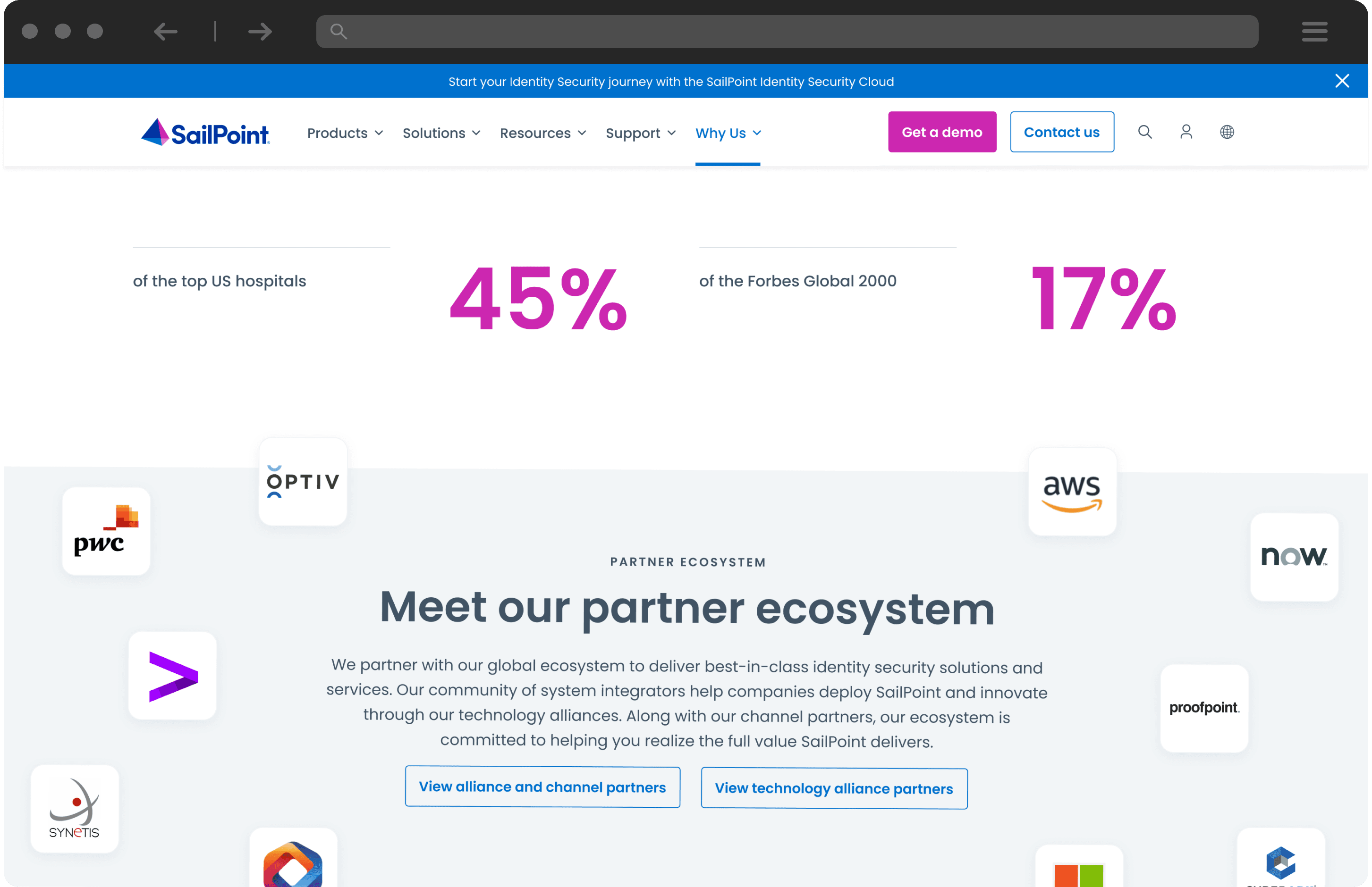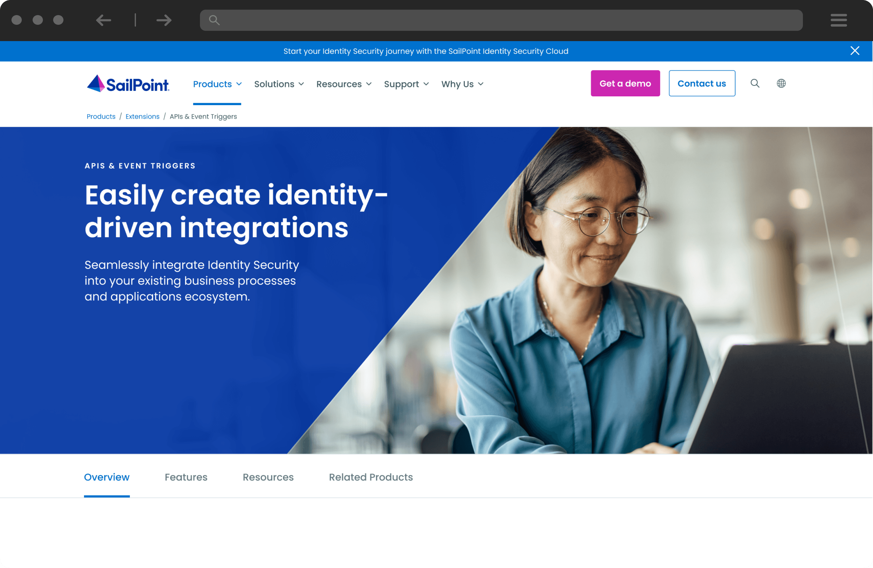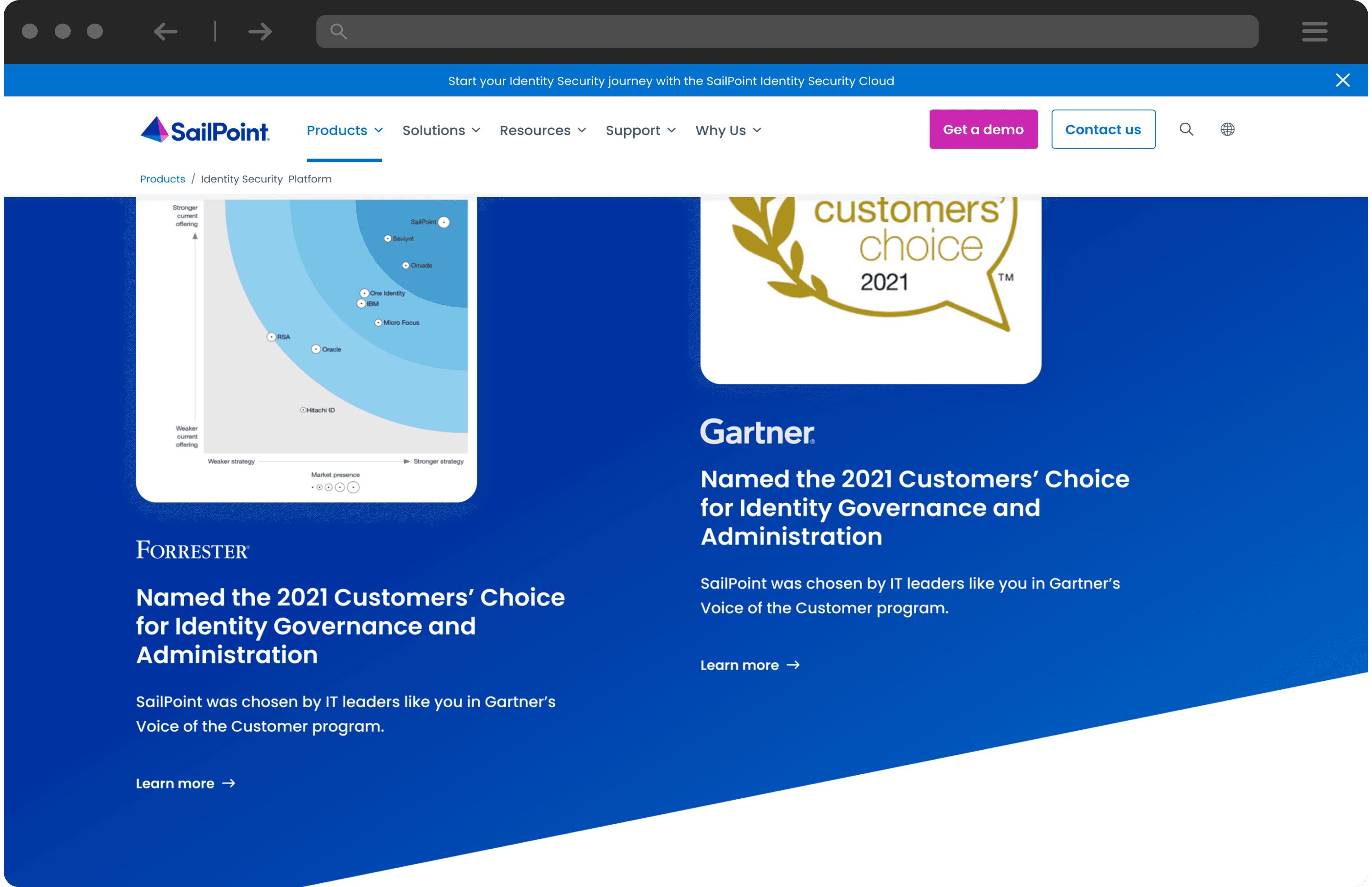 The SailPoint brand team knew which direction they wanted to go visually. Working collaboratively, the Clear Digital team developed a comprehensive sitewide design system, including icons and graphics. We also designed a new product mock-up style that highlights key pieces of information, making it easier for users to understand what products do. Plus, implementing consistent visual style helps to reinforce the new brand and boost overall visibility—a key goal.